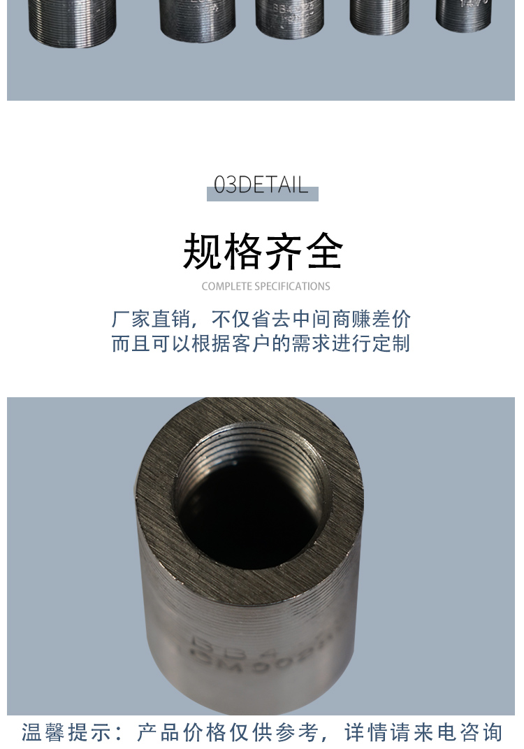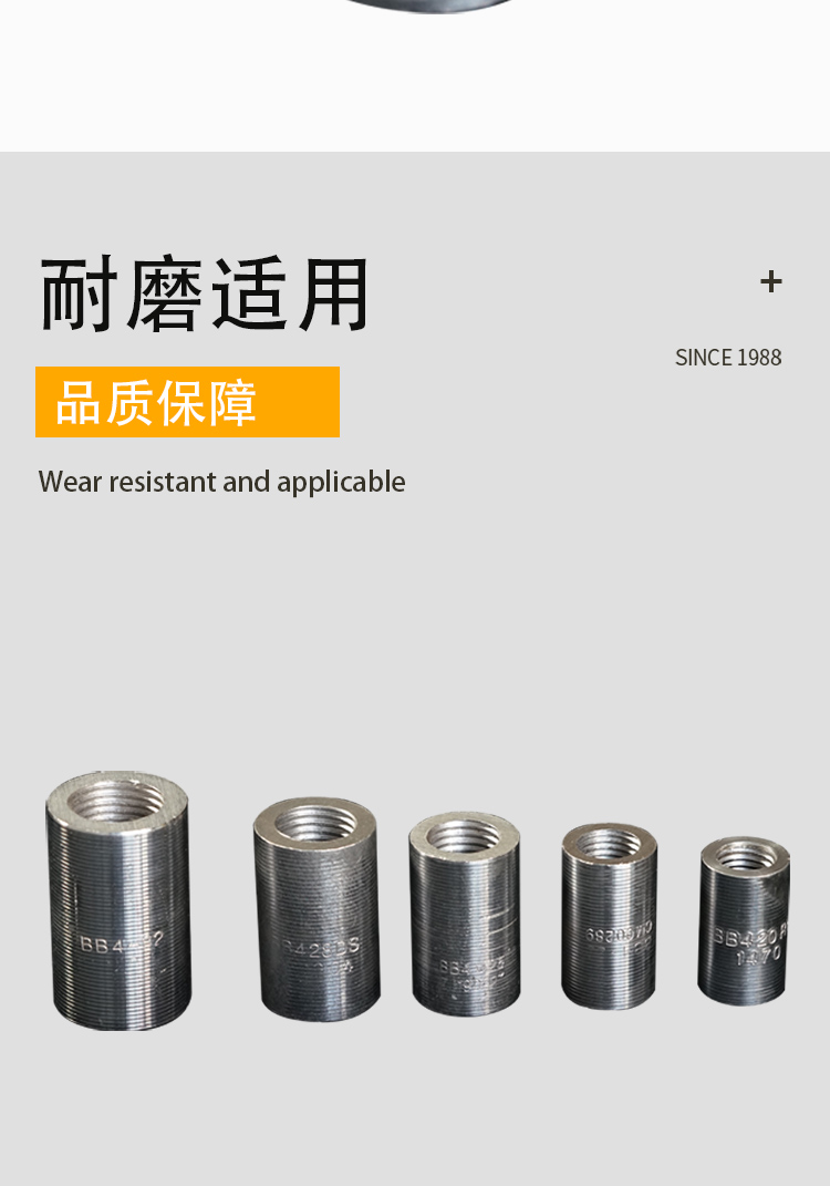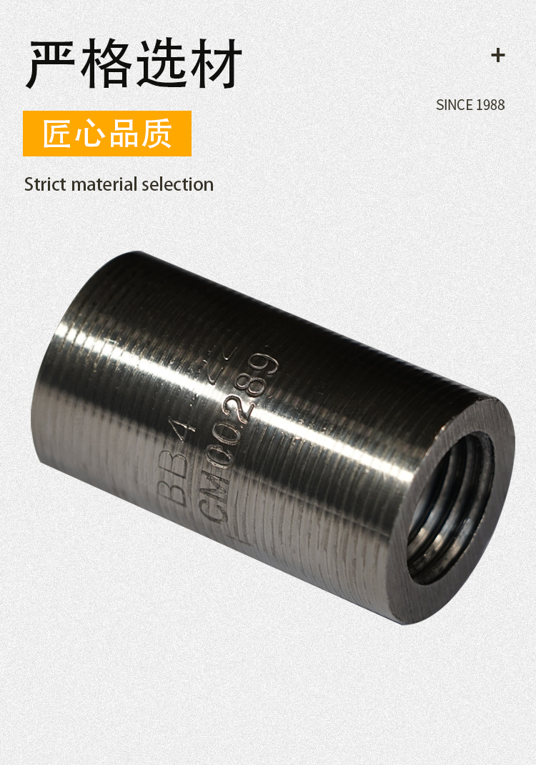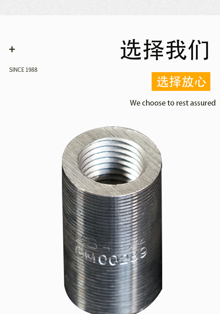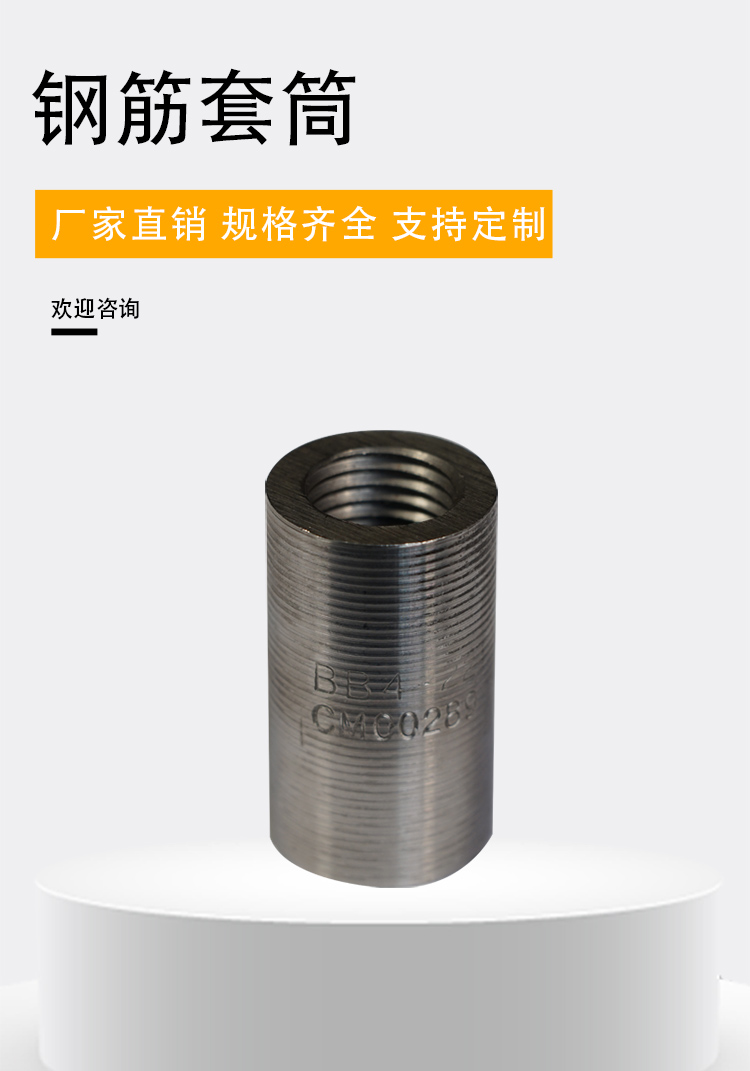 鋼(gāng)筋套筒(tǒng)又名鋼筋接頭(tóu):用以連(lián)接鋼筋且具有與絲頭螺紋(wén)相對應內螺紋(wén)的連接(jiē)件。簡單的施工流程:將鋼筋(jīn)端部(bù)用滾軋工藝加工成直螺紋,並用相應的連接套筒將兩根鋼筋相互連接。鋼筋套筒(tǒng)通常是用精密鋼管進行生產的。專門用於生產鋼筋套筒的精密鋼管采用的是45#鋼材,通常又被稱為“鋼筋連接套(tào)管(guǎn)”。鋼筋套筒***可靠,連(lián)接方便,便於檢測。