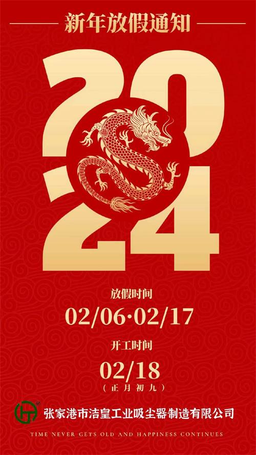 在2024年新春佳節來臨之際,潔(jié)皇(huáng)工業(yè)全體員工提前恭祝廣大新老客戶新春快樂、生意興隆、萬事如意!非常感謝您對我們工(gōng)作的支持和信任。根據(jù)我司實(shí)際工作情況,2024年春節放假安排如下:
